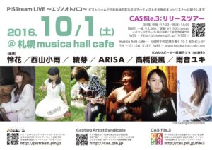 こちらのイベントは「PiSTream」によって収録・オンエアされています! ご来場&ご出演ありがとうございました! キャスルズ札幌「エゾノオトバコ」 Casting Artist Syndicate:PiSTream L … 続きを読む 2016.10.1「キャスルズ札幌」PiSTream LiVE