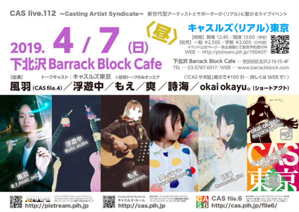 CAS file.4収録の「風羽」、久々出演の「浮遊中」、初登場の「詩海」「okai okayu。」など、見逃せない一日になりそうです!!!
