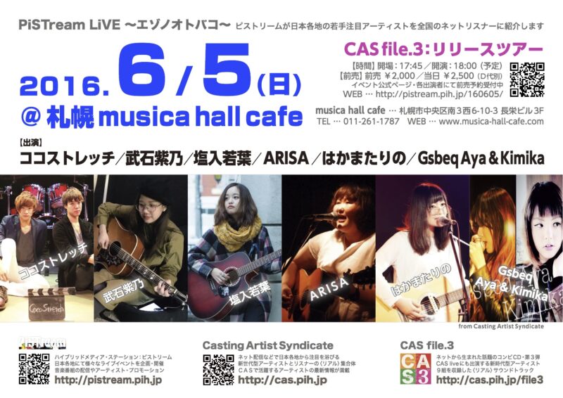 In CAS file.3, CONTACT, EVENT, PiSTream, PiSTream Live, PRODUCT, PROGRAM, TICKET, エゾノオトバコ, キャスルズ, キャスルズ札幌