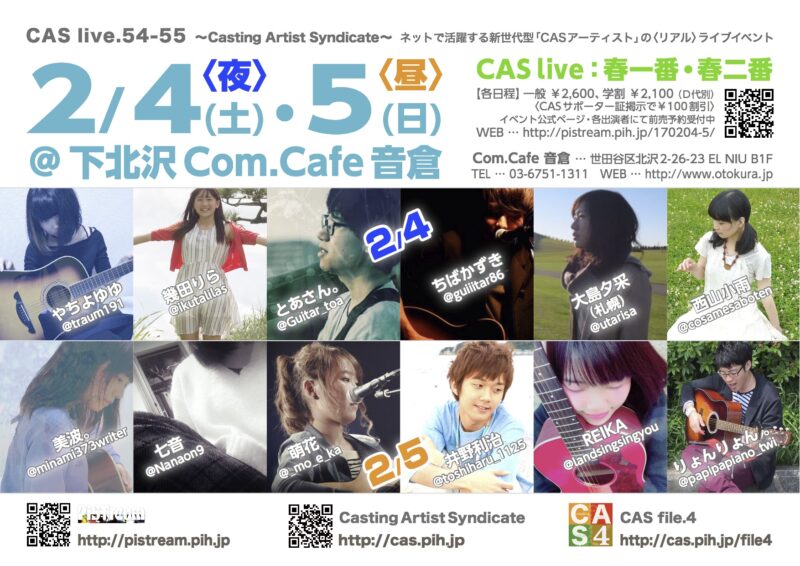 2017.2.4-5「キャスルズ東京〈2DAYS〉春一番・春二番」Casting Artist Syndicate Post date 161213 By pistream In CAS file.4, CAS live, CAS tube, Casting Artist Syndicate, CONTACT, EVENT, PiSTream, PRODUCT, PROGRAM, TICKET TagsCASCAS file.4CAS liveCasting Artist SyndicateCom.Cafe 音倉PiSTreamREIKAちばかずきとあさん。ピストリームやちよゆゆりょんりょん七音下北沢井野利治仙台大島夕采奥山汐理幾田りら春一番春二番札幌美波萌花西山小雨